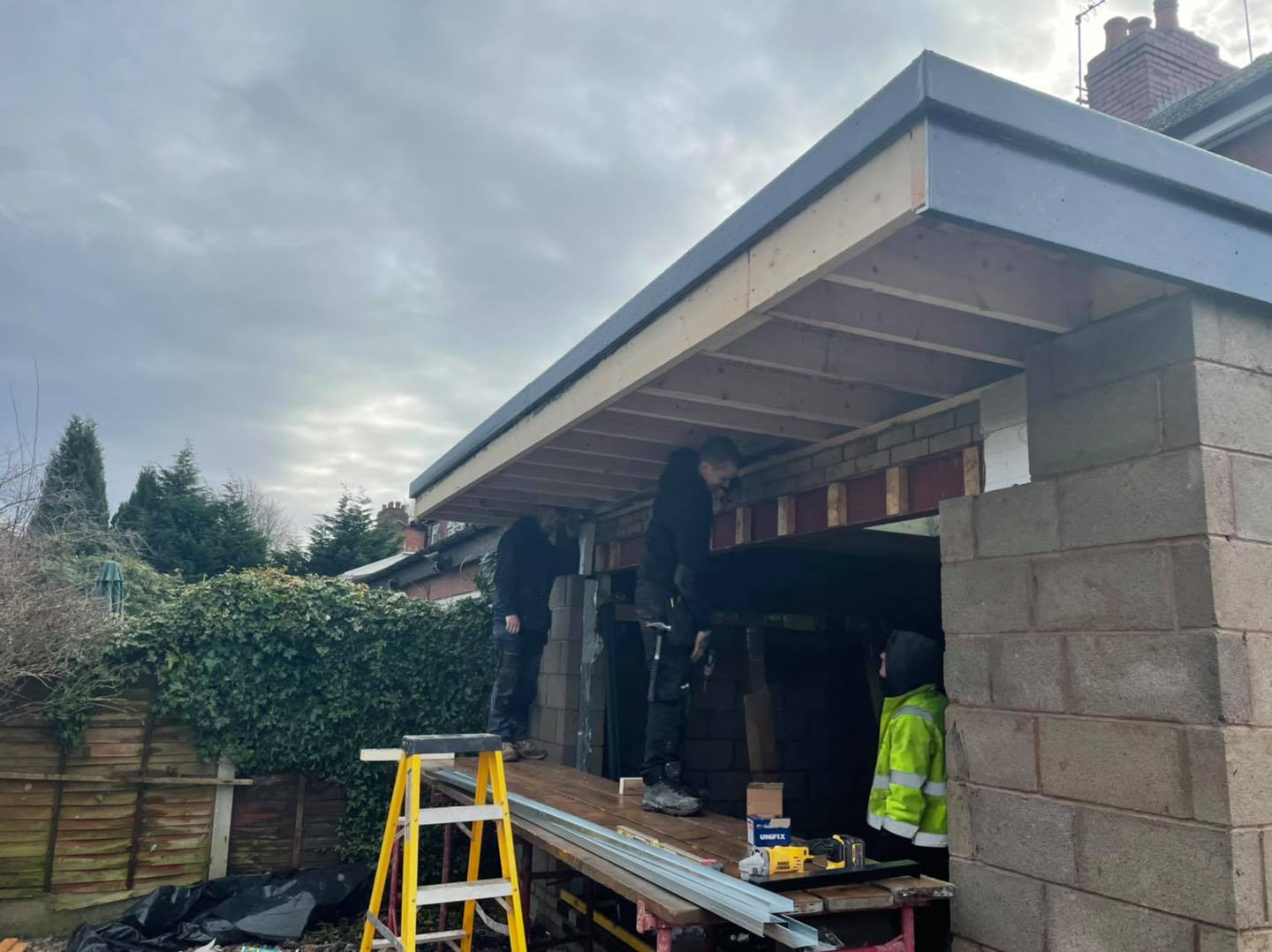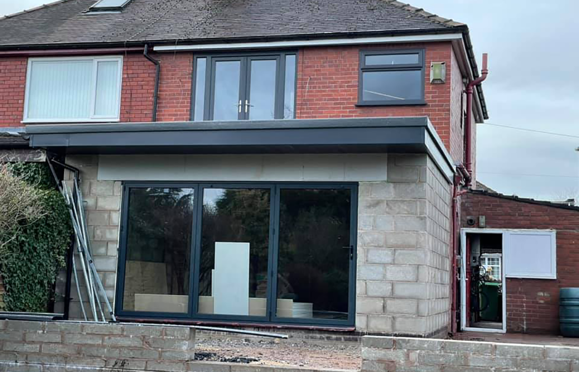 Rear extension with bi-folding doors and a large lantern roof light. We are also installing a jubilee balcony and patio door set to the rear bedroom together with large external patio area and landscaping.